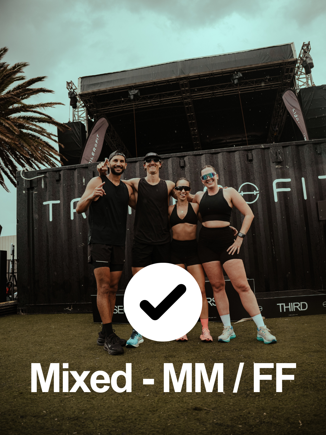 Mixed doubles - Two athletes take on the entire workout and cross the finish line together, ideal for those with more confidence on the comp floor who want to push a bit further.
